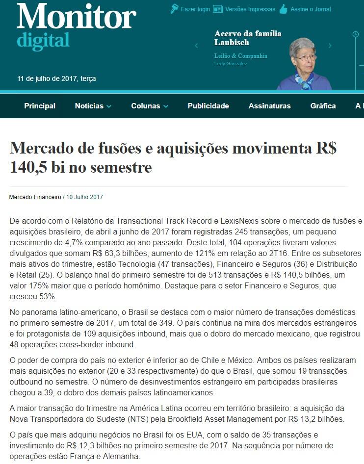 De acordo com o Relatório da Transactional Track Record e LexisNexis sobre o mercado de fusões e aquisições brasileiro, de abril a junho de 2017 foram registradas 245 transações, um pequeno crescimento de 4,7% comparado ao ano passado. Deste total, 104 operações tiveram valores divulgados que somam R$ 63,3 bilhões, aumento de 121% em relação ao 2T16. Entre os subsetores mais ativos do trimestre, estão Tecnologia (47 transações), Financeiro e Seguros (36) e Distribuição e Retail (25). O balanço final do primeiro semestre foi de 513 transações e R$ 140,5 bilhões, um valor 175% maior que o período homônimo. Destaque para o setor Financeiro e Seguros, que cresceu 53%.