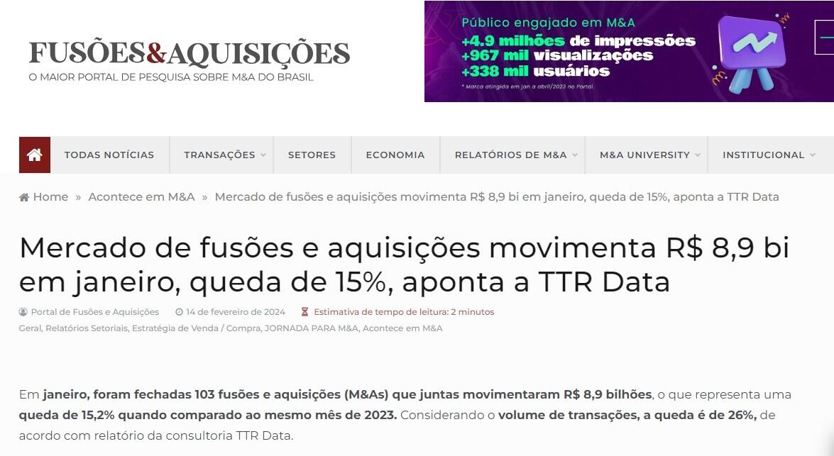 Mercado de fusões e aquisições movimenta R$ 8,9 bi em janeiro, queda de 15%, aponta a TTR Data