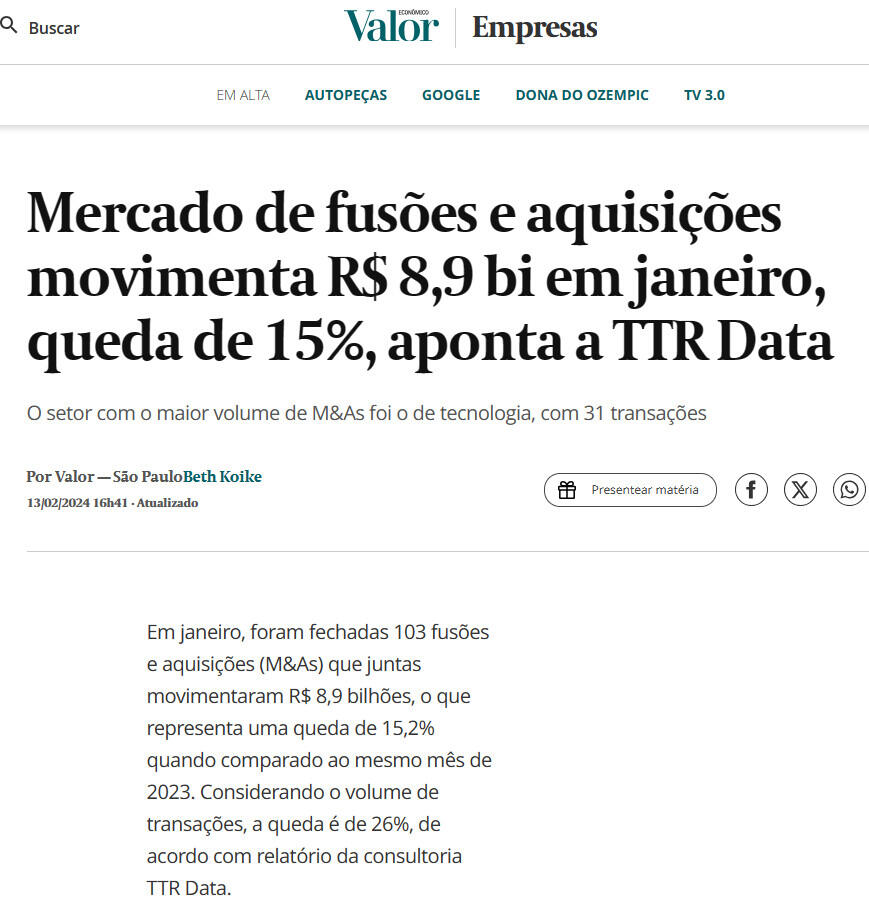 Mercado de fusões e aquisições movimenta R$ 8,9 bi em janeiro, queda de 15%, aponta a TTR Data
