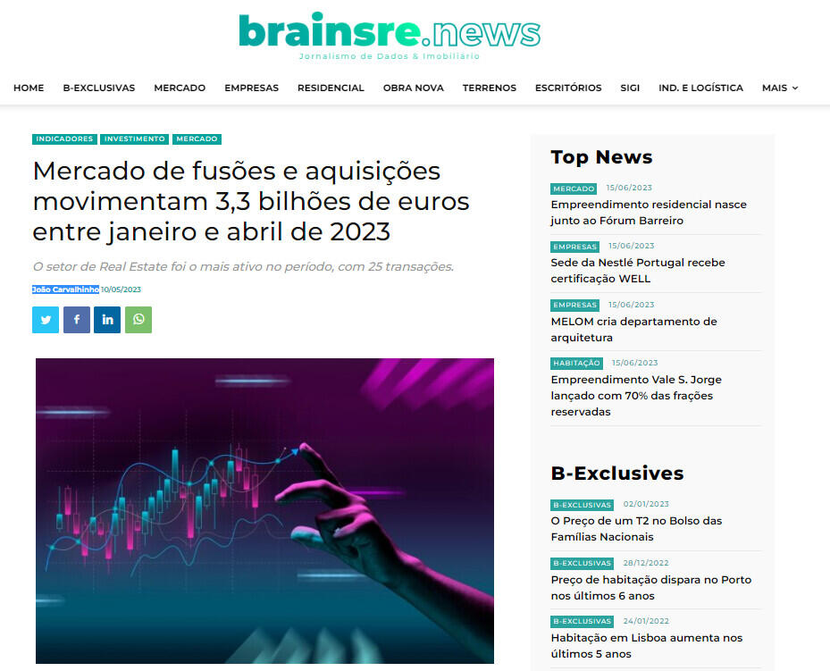 O mercado transacional português registou, entre janeiro e abril de 2023, 152 operações com valor total de 3,3 bilhões de euros, no qual 41% do total das transações possui os valores revelados, de acordo com o mais recente relatório do TTR Data.