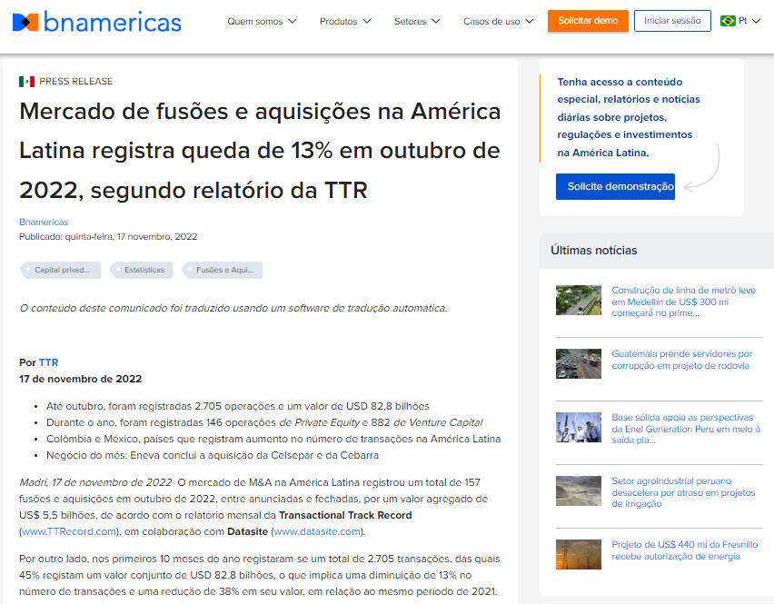 Mercado de fusões e aquisições na América Latina registra queda de 13% em outubro de 2022, segundo relatório da TTR
