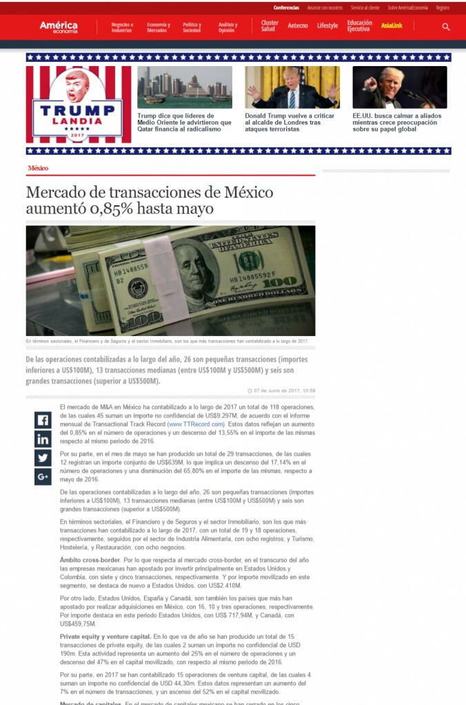 El mercado de M&A en México ha contabilizado a lo largo de 2017 un total de 118 operaciones, de las cuales 45 suman un importe no confidencial de US$9.297M, de acuerdo con el informe mensual de Transactional Track Record (www.TTRecord.com). Estos datos reflejan un aumento del 0,85% en el número de operaciones y un descenso del 13,55% en el importe de las mismas respecto al mismo periodo de 2016.
