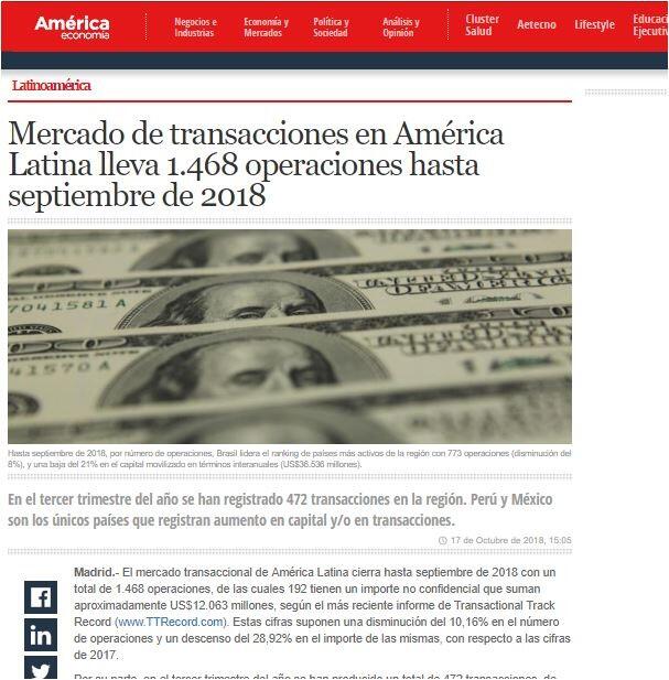 Mercado de transacciones en América Latina lleva 1.468 operaciones hasta septiembre de 2018