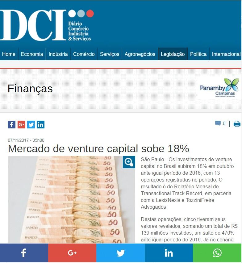 São Paulo - Os investimentos de venture capital no Brasil subiram 18% em outubro ante igual período de 2016, com 13 operações registradas no período. O resultado é do Relatório Mensal do Transactional Track Record, em parceria com a LexisNexis e TozziniFreire Advogados