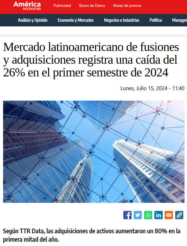 Mercado latinoamericano de fusiones y adquisiciones registra una caída del 26% en el primer semestre de 2024