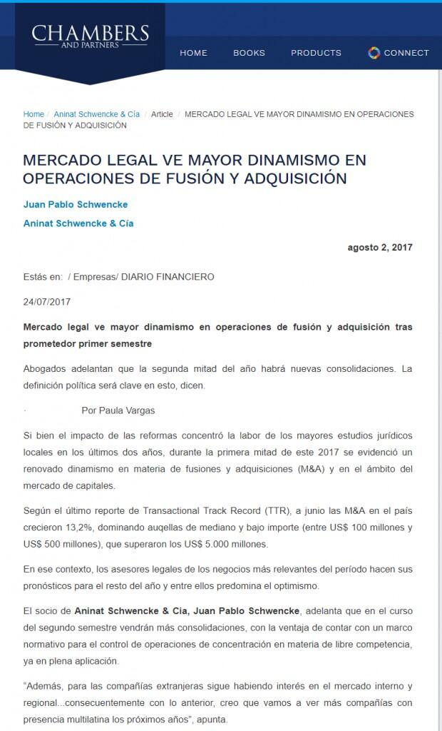 Aninat Schwencke & Cia, en tanto, participó en la venta de las acciones de la marca chilena Lippi al FIP Endurance Outdoor y asesoró a Genera Austral en la venta de sus acciones al fondo de inversión BIO E SpA y a Zoma Capital y Encourage Capital en la compra de un paquete de acciones de la chilena Geomar.