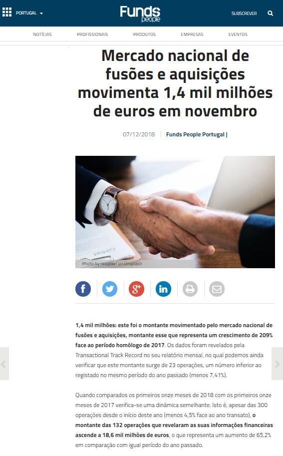 Mercado nacional de fusões e aquisições movimenta 1,4 mil milhões de euros em novembro