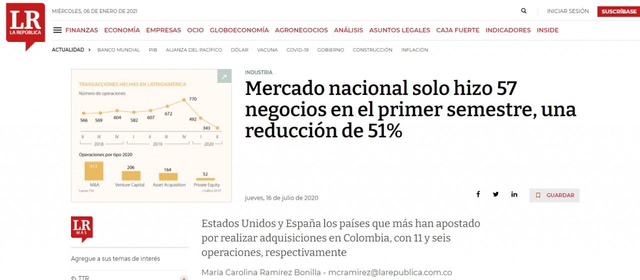 Este primer semestre del año no ha sido favorable para el negocio de fusiones y adquisiciones en Colombia. Según el más reciente informe de Transactional Track Record (TTR) el número de negocios que se hicieron en Colombia tuvo una caída de 51% y en total se realizaron 57 operaciones por un monto de US$2.367 millones.