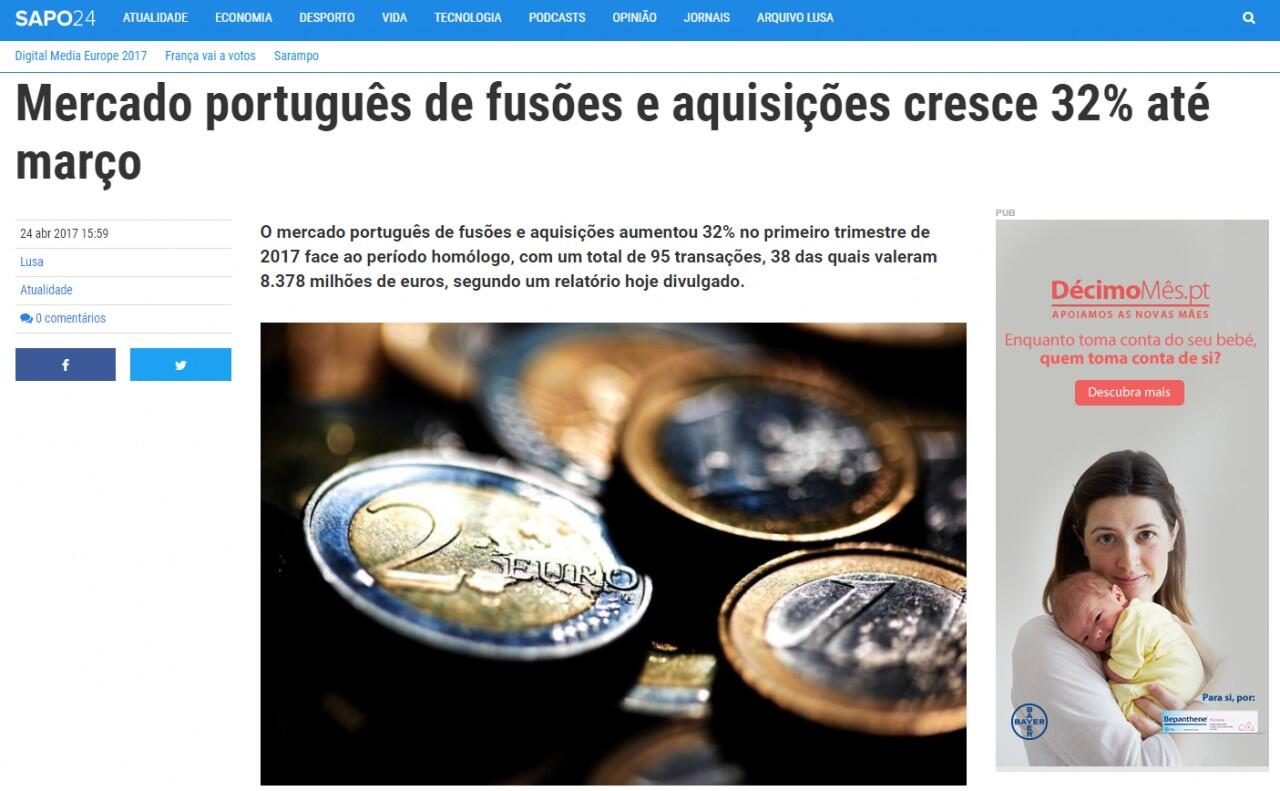 O mercado português de fusões e aquisições aumentou 32% no primeiro trimestre de 2017 face ao período homólogo, com um total de 95 transações, 38 das quais valeram 8.378 milhões de euros, segundo um relatório hoje divulgado.