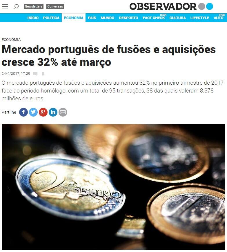 O mercado português de fusões e aquisições aumentou 32% no primeiro trimestre de 2017 face ao período homólogo, com um total de 95 transações, 38 das quais valeram 8.378 milhões de euros.