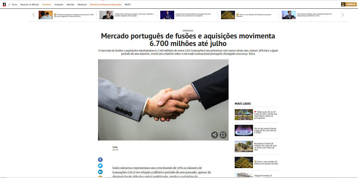 Mercado português de fusões e aquisições movimenta 6.700 milhões até julho