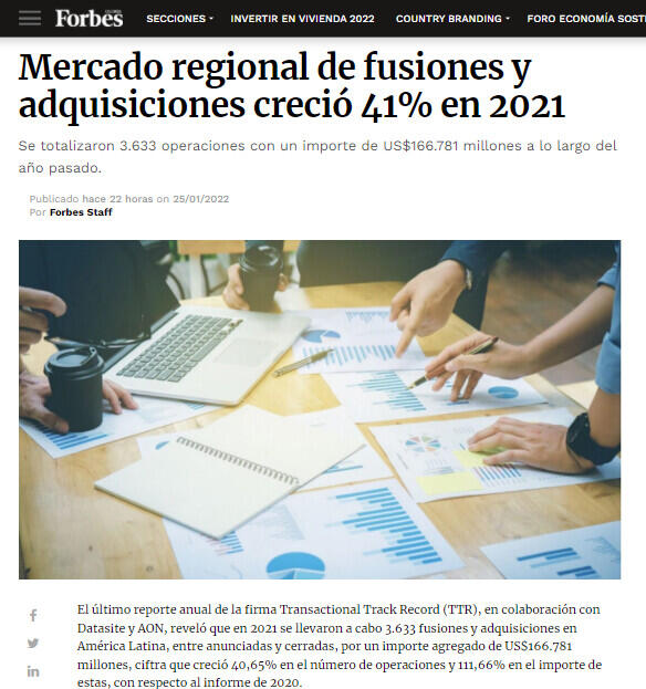 El último reporte anual de la firma Transactional Track Record (TTR), en colaboración con Datasite y AON, reveló que en 2021 se llevaron a cabo 3.633 fusiones y adquisiciones en América Latina, entre anunciadas y cerradas, por un importe agregado de US$166.781 millones, ciftra que creció 40,65% en el número de operaciones y 111,66% en el importe de estas, con respecto al informe de 2020.