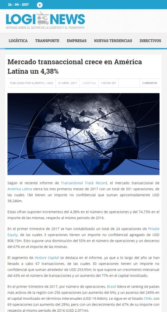 Según el reciente informe de Transactional Track Record, el mercado transaccional de América Latina cierra los tres primeros meses de 2017 con un total de 501 operaciones, de las cuales 184 tienen un importe no confidencial que suman aproximadamente USD 38.246m.