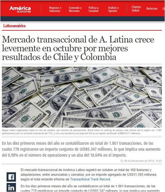 El mercado transaccional de América Latina registró en octubre un total de 168 fusiones y adquisiciones, entre anunciadas y cerradas, por un importe agregado de US$11.393 millones, según el más reciente informe de Transactional Track Record.