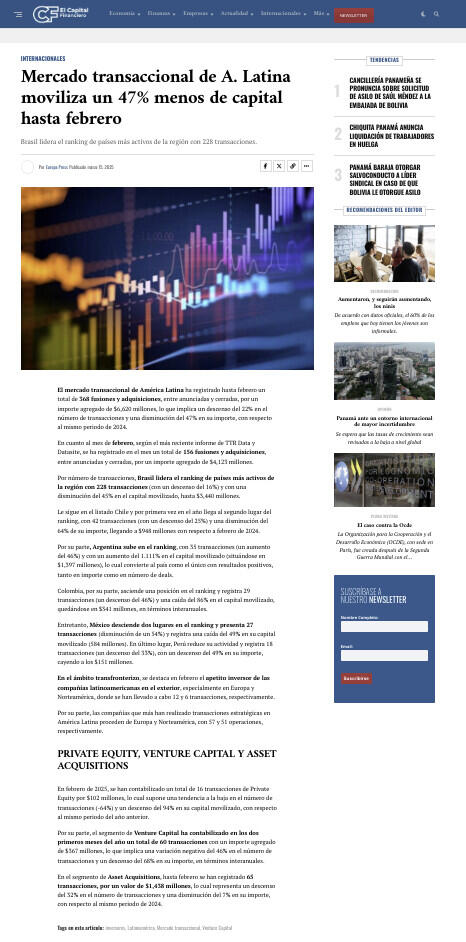 Mercado transaccional de A. Latina moviliza un 47% menos de capital hasta febrero
