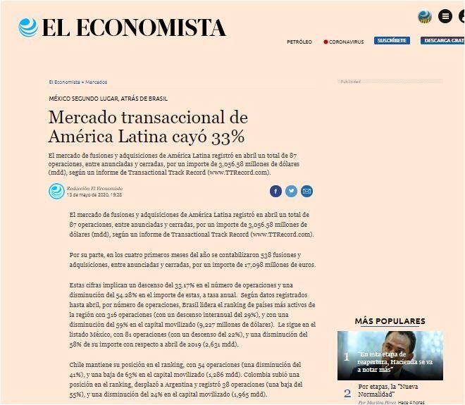Estas cifras implican un descenso del 33.17% en el número de operaciones y una disminución del 54.28% en el importe de estas, a tasa anual. Según datos registrados hasta abril, por número de operaciones, Brasil lidera el ranking de países más activos de la región con 316 operaciones (con un descenso interanual del 29%), y con una disminución del 59% en el capital movilizado (9,227 millones de dólares). Le sigue en el listado México, con 81 operaciones (con un descenso del 22%), y una disminución del 58% de su importe con respecto a abril de 2019 (2,631 mdd).