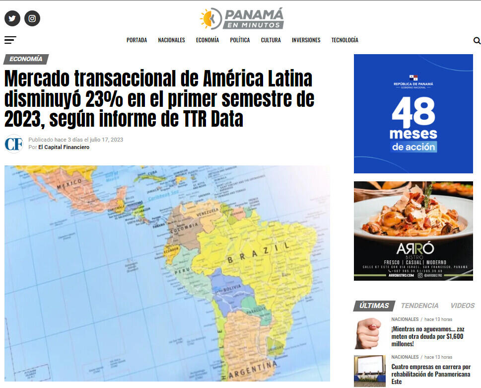 Mercado transaccional de América Latina disminuyó 23% en el primer semestre de 2023, según informe de TTR Data