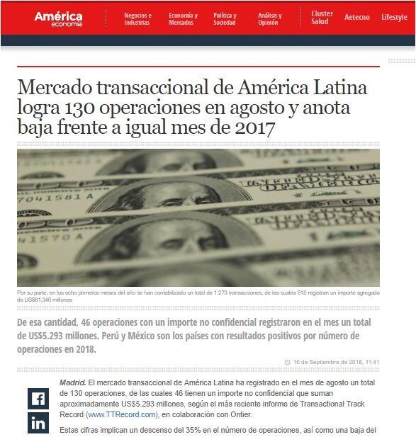 Mercado transaccional de América Latina logra 130 operaciones en agosto y anota baja frente a igual mes de 2017