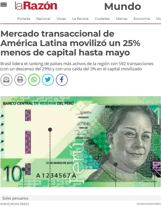 En último lugar, Perú disminuye su actividad y registra 48 transacciones (un descenso del 16%), con un retroceso interanual del 65% en su importe, hasta 1.342 millones de dólares (1.246 millones de euros).