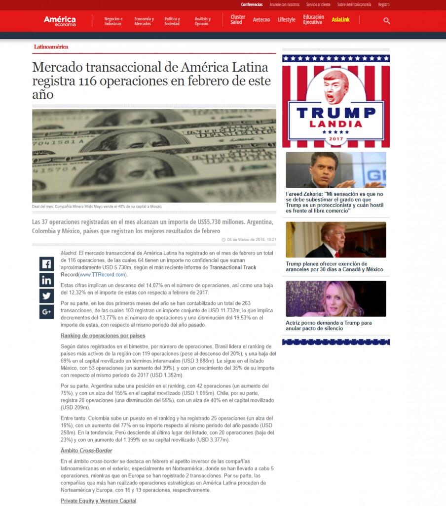 Madrid. El mercado transaccional de América Latina ha registrado en el mes de febrero un total de 116 operaciones, de las cuales 64 tienen un importe no confidencial que suman aproximadamente USD 5.730m, según el más reciente informe de Transactional Track Record (www.TTRecord.com).