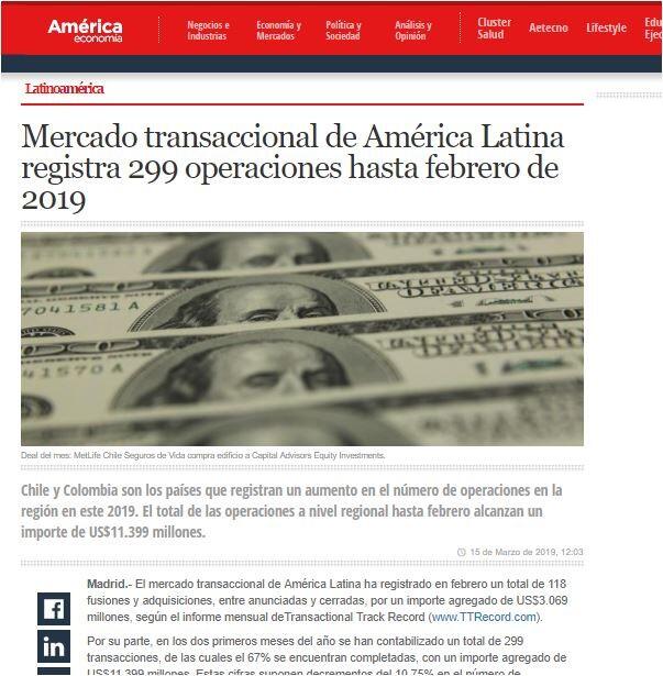 Mercado transaccional de América Latina registra 299 operaciones hasta febrero de 2019