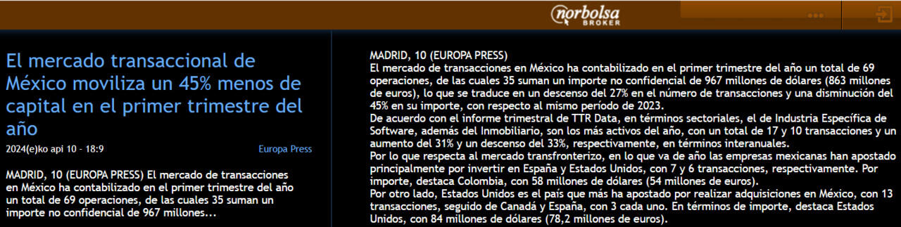 Mercado transaccional de México moviliza un 45% menos de capital durante primer trimestre de 2024