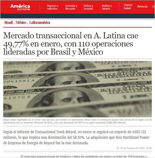 Mercado transaccional en A. Latina cae 49,77% en enero, con 110 operaciones lideradas por Brasil y México