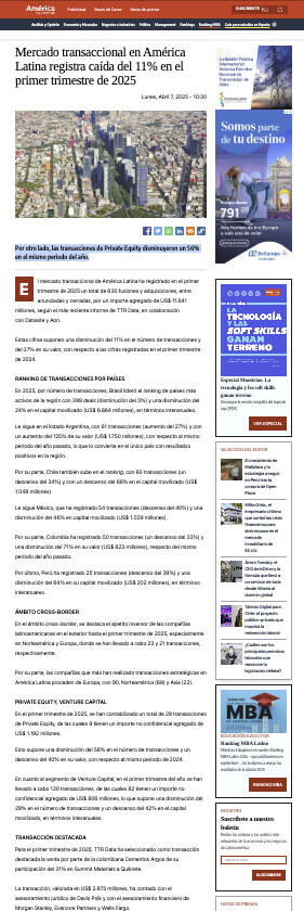 Mercado transaccional en América Latina registra caída del 11% en el primer trimestre de 2025