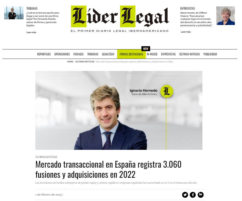 TTR Data conversó para esta edición anual con el socio de la firma Allen & Overy, Ignacio Hornedo, y analizó las perspectivas del mercado transaccional de España en medio de la coyuntura económica actual.