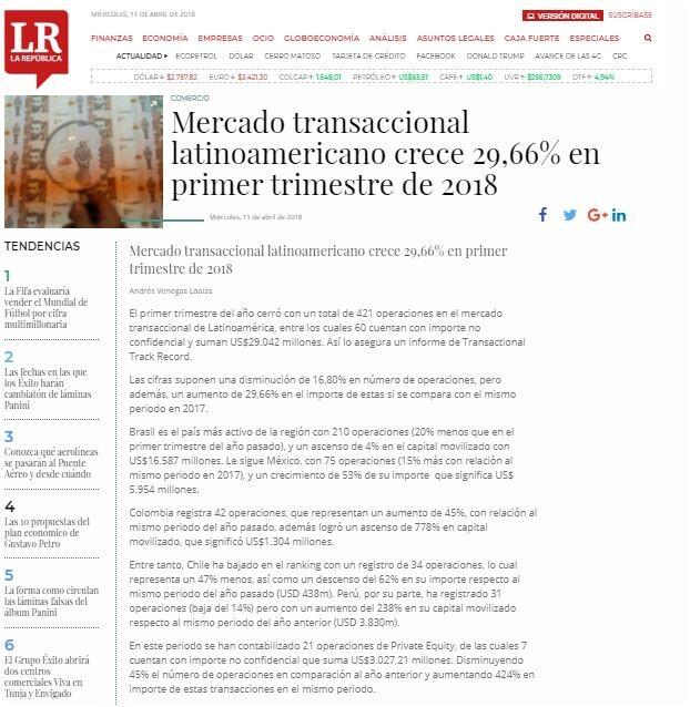 Mercado transaccional latinoamericano crece 29,66% en primer trimestre de 2018