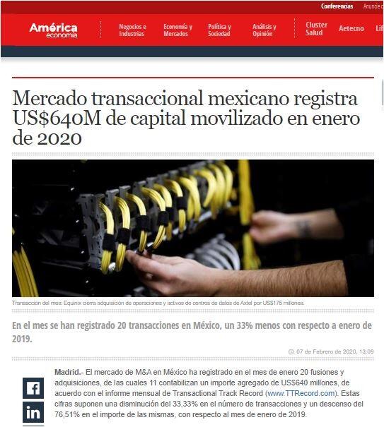 El mercado de M&A en México ha registrado en el mes de enero 20 fusiones y adquisiciones, de las cuales 11 contabilizan un importe agregado de US$640 millones, de acuerdo con el informe mensual de Transactional Track Record (www.TTRecord.com). Estas cifras suponen una disminución del 33,33% en el número de transacciones y un descenso del 76,51% en el importe de las mismas, con respecto al mes de enero de 2019.