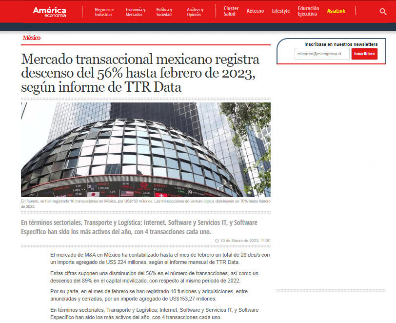 Mercado transaccional mexicano registra descenso del 56% hasta febrero de 2023, según informe de TTR Data