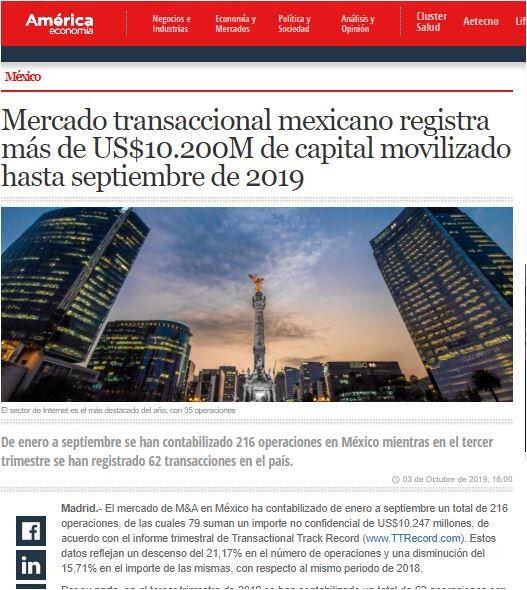 Mercado transaccional mexicano registra más de US$10.200M de capital movilizado hasta septiembre de 2019