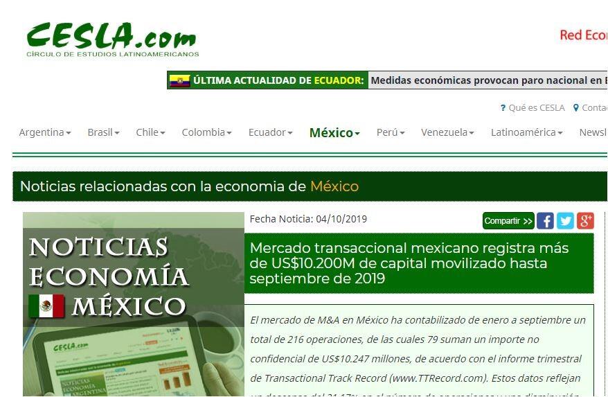 Mercado transaccional mexicano registra más de US$10.200M de capital movilizado hasta septiembre de 2019