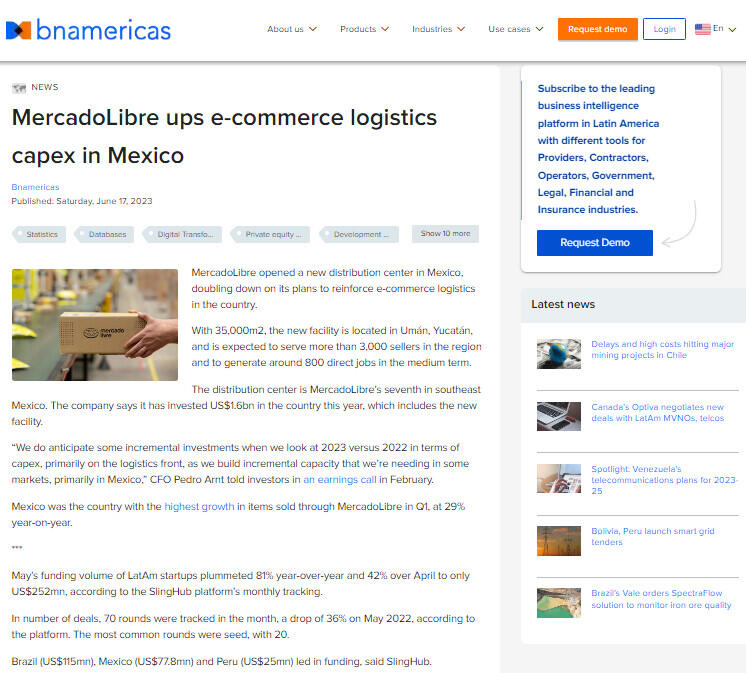 The distribution center is MercadoLibre’s seventh in southeast Mexico. The company says it has invested US$1.6bn in the country this year, which includes the new facility.