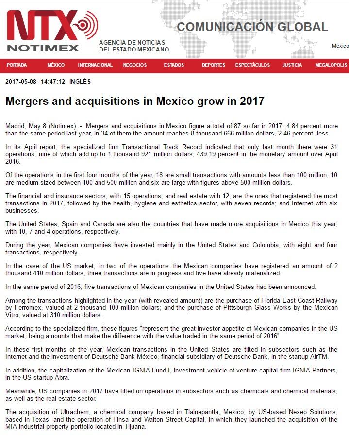 The acquisition of Ultrachem, a chemical company based in Tlalnepantla, Mexico, by US-based Nexeo Solutions, based in Texas; and the operation of Finsa and Walton Street Capital, in which they launched the acquisition of the MIA industrial property portfolio located in Tijuana.