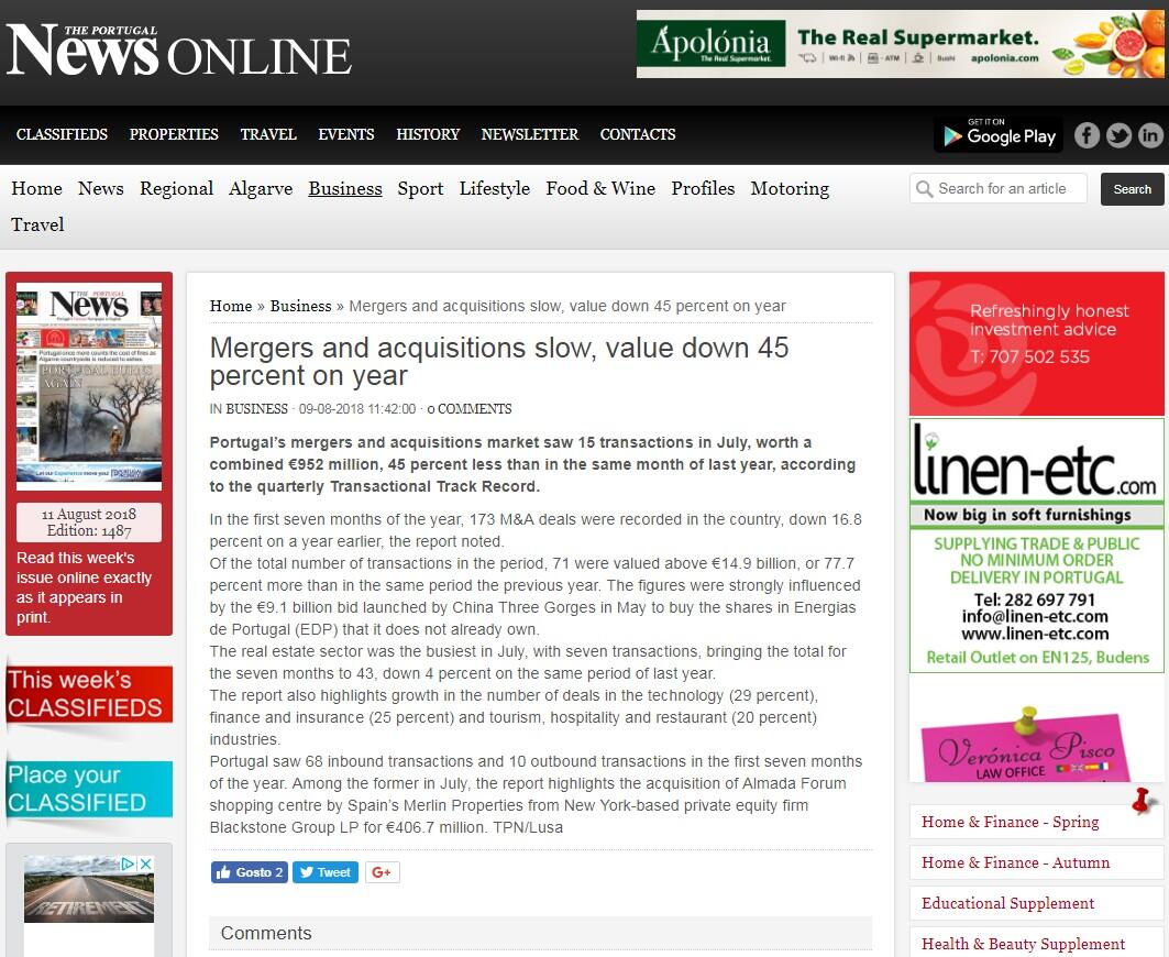 Portugal’s mergers and acquisitions market saw 15 transactions in July, worth a combined €952 million, 45 percent less than in the same month of last year, according to the quarterly Transactional Track Record.