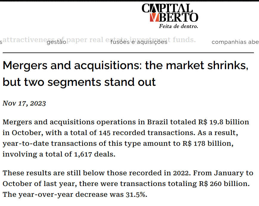 These results are still below those recorded in 2022. From January to October of last year, there were transactions totaling R$ 260 billion. The year-over-year decrease was 31.5%.