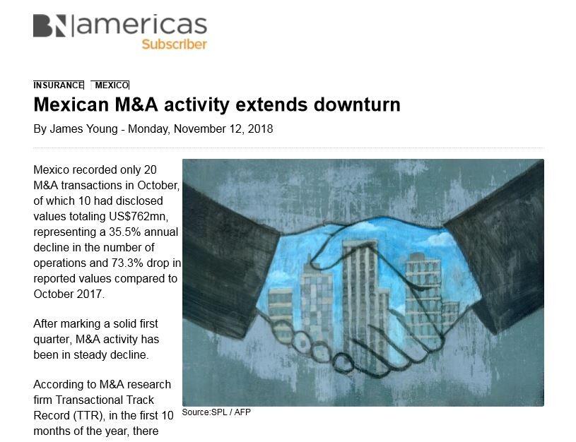 Mexico recorded only 20 M&A transactions in October, of which 10 had disclosed values totaling US$762mn, representing a 35.5% annual decline in the number of operations and 73.3% drop in reported values compared to October 2017.