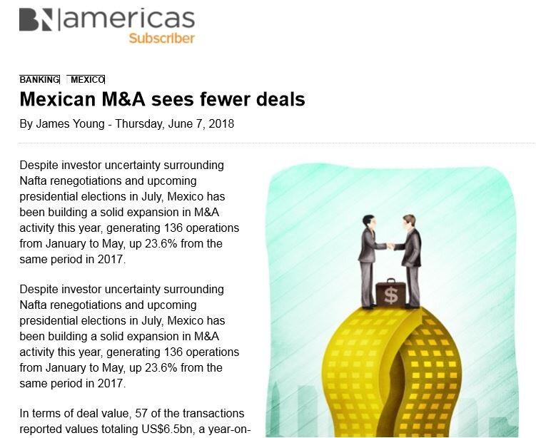 Despite investor uncertainty surrounding Nafta renegotiations and upcoming presidential elections in July, Mexico has been building a solid expansion in M&A activity this year, generating 136 operations from January to May, up 23.6% from the same period in 2017.