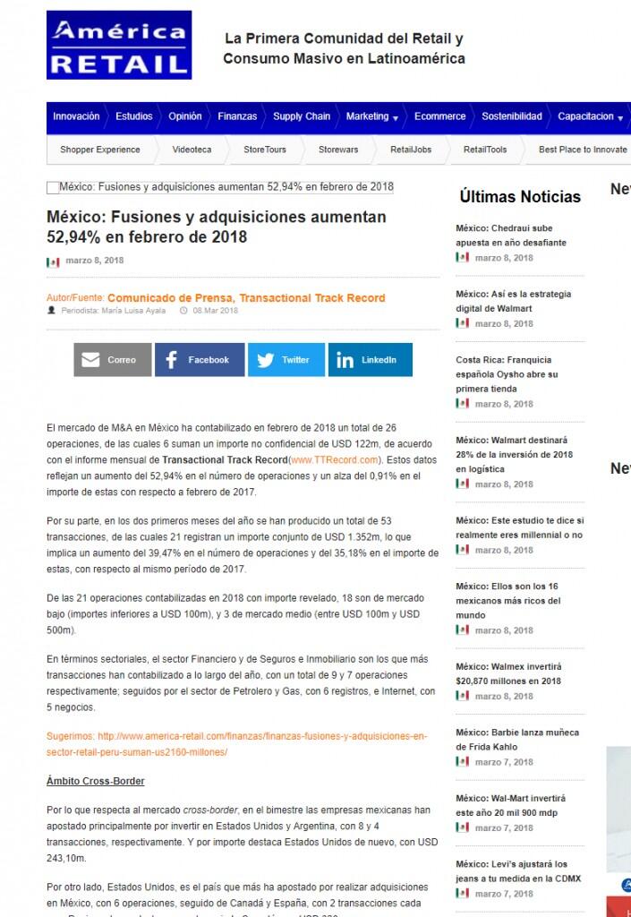 El mercado de M&A en México ha contabilizado en febrero de 2018 un total de 26 operaciones, de las cuales 6 suman un importe no confidencial de USD 122m, de acuerdo con el informe mensual de Transactional Track Record (www.TTRecord.com). Estos datos reflejan un aumento del 52,94% en el número de operaciones y un alza del 0,91% en el importe de estas con respecto a febrero de 2017.
