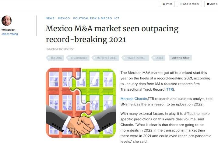 The Mexican M&A market got off to a mixed start this year on the heels of a record-breaking 2021, according to January data from M&A-focused research firm Transactional Track Record (TTR). Marcela Chacón,TTR research and business analyst, told BNamericas there is reason to be upbeat on 2022. With many external factors in play, it is difficult to make specific predictions on this year’s deal volume, said Chacón.