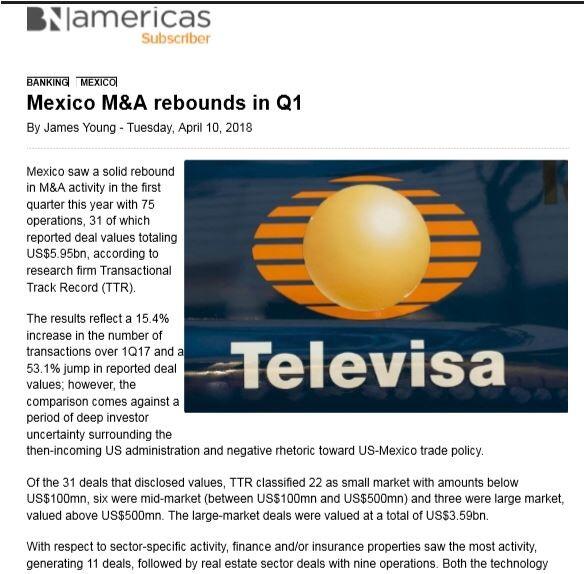 The results reflect a 15.4% increase in the number of transactions over 1Q17 and a 53.1% jump in reported deal values; however, the comparison comes against a period of deep investor uncertainty surrounding the thenincoming US administration and negative rhetoric toward USMexico trade policy.