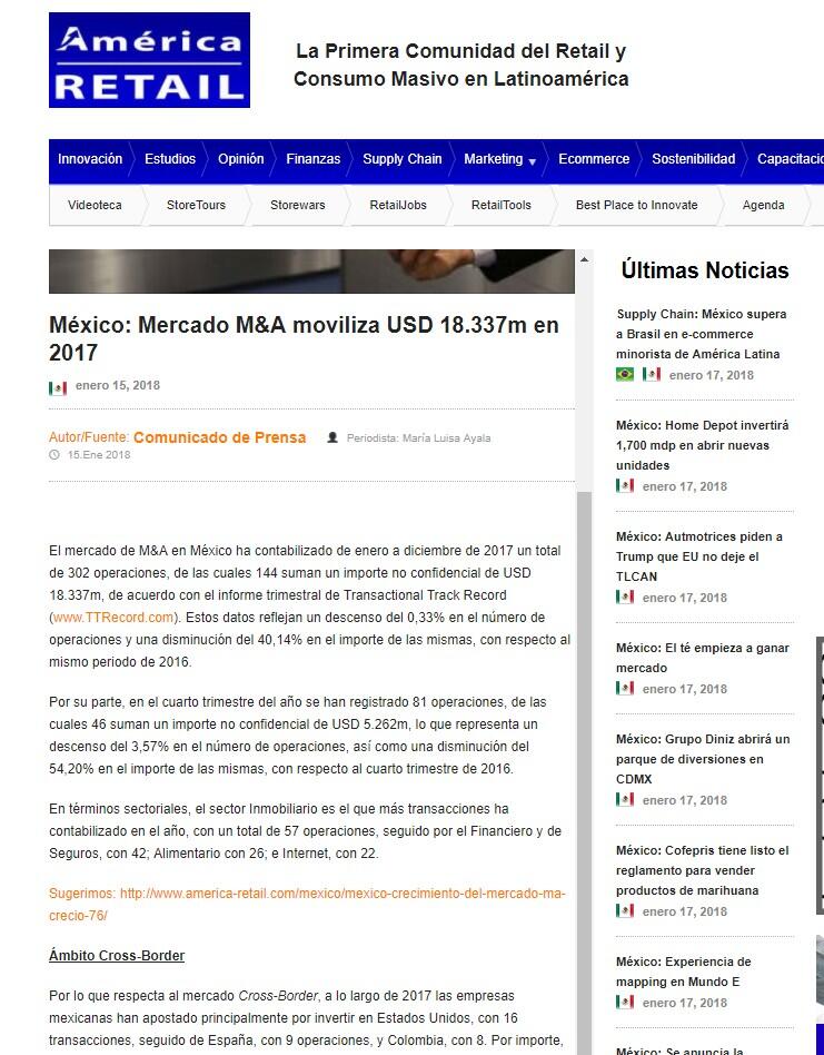 El mercado de M&A en México ha contabilizado de enero a diciembre de 2017 un total de 302 operaciones, de las cuales 144 suman un importe no confidencial de USD 18.337m, de acuerdo con el informe trimestral de Transactional Track Record (www.TTRecord.com). Estos datos reflejan un descenso del 0,33% en el número de operaciones y una disminución del 40,14% en el importe de las mismas, con respecto al mismo periodo de 2016.