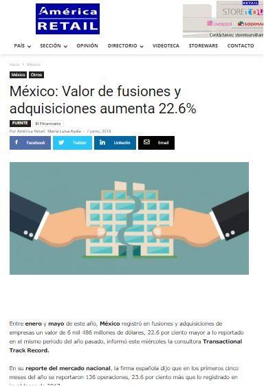 Entre enero y mayo de este año, México registró en fusiones y adquisiciones de empresas un valor de 6 mil 486 millones de dólares, 22.6 por ciento mayor a lo reportado en el mismo periodo del año pasado, informó este miércoles la consultora Transactional Track Record.