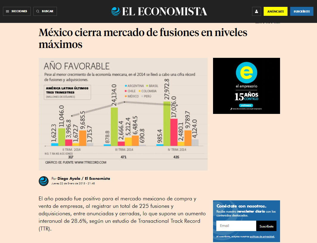 El año pasado fue positivo para el mercado mexicano de compra y venta de empresas, al registrar un total de 225 fusiones y adquisiciones, entre anunciadas y cerradas, lo que supone un aumento interanual de 28.6%, según un estudio de Transactional Track Record (TTR).