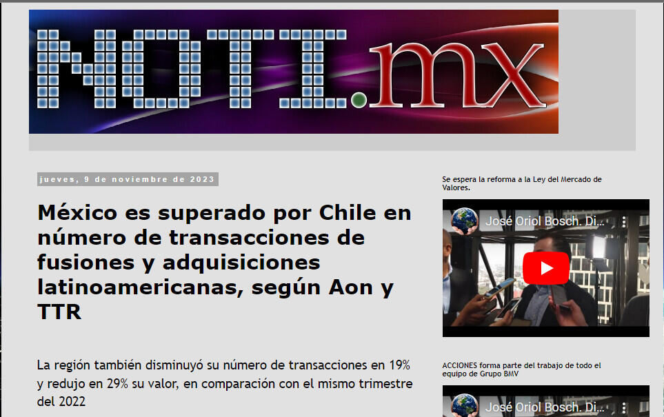 Ciudad de México, 08 de noviembre 2023 – Aon plc (NYSE: AON), firma líder mundial en servicios profesionales, dio a conocer el informe del tercer trimestre de 2023 sobre el mercado transaccional de fusiones y adquisiciones de América Latina realizado en conjunto con TTR Data, que México fue superado por Chile con 256 transacciones entre anunciadas y cerradas (descenso del 24% con respecto al tercer trimestre del 2022), pero mantuvo su segunda posición en Latinoamérica con la reducción del 8% de su importe, con un valor de 11,719 millones de dólares.