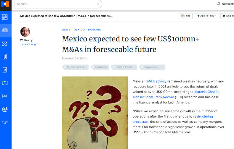 Mexican M&A activity remained weak in February, with any recovery later in 2021 unlikely to see the return of deals valued at over US$100mn, according to Marcela Chacón, Transactional Track Record (TTR) research and business intelligence analyst for Latin America.