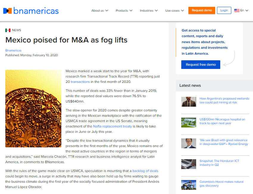 Mexico marked a weak start to the year for M&A, with research firm Transactional Track Record (TTR) reporting just 20 transactions in the first month of 2020.