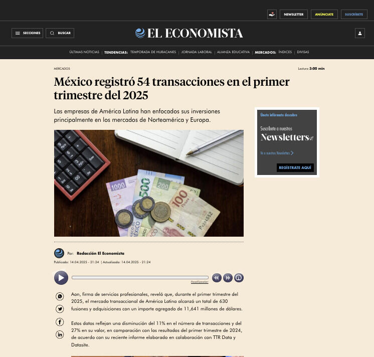 Aon, firma de servicios profesionales, reveló que, durante el primer trimestre del 2025, el mercado transaccional de América Latina alcanzó un total de 630 fusiones y adquisiciones con un importe agregado de 11,641 millones de dólares.